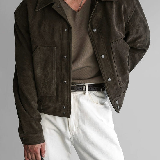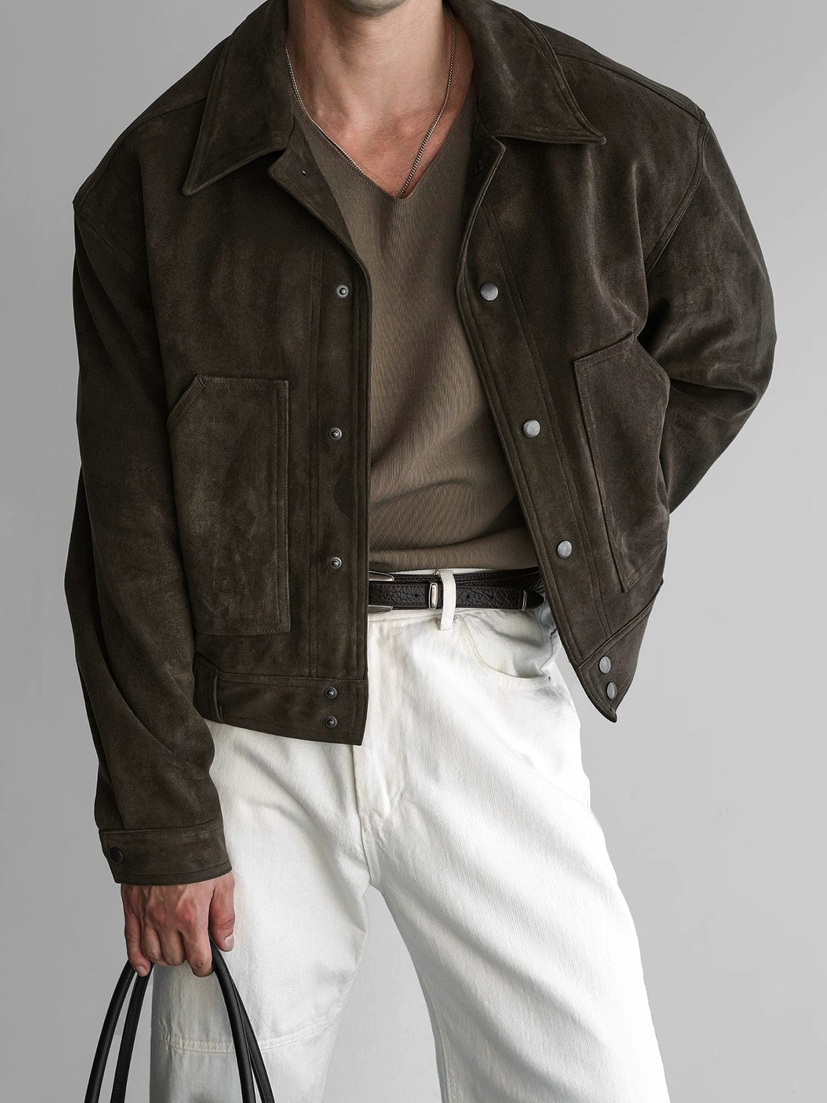 Discover RT No. 12111 Suede Collar Jacket, a refined addition to your outerwear lineup. This suede jacket features a classic button-up front and a soft, statement suede collar, offered in two color options to suit your style.
