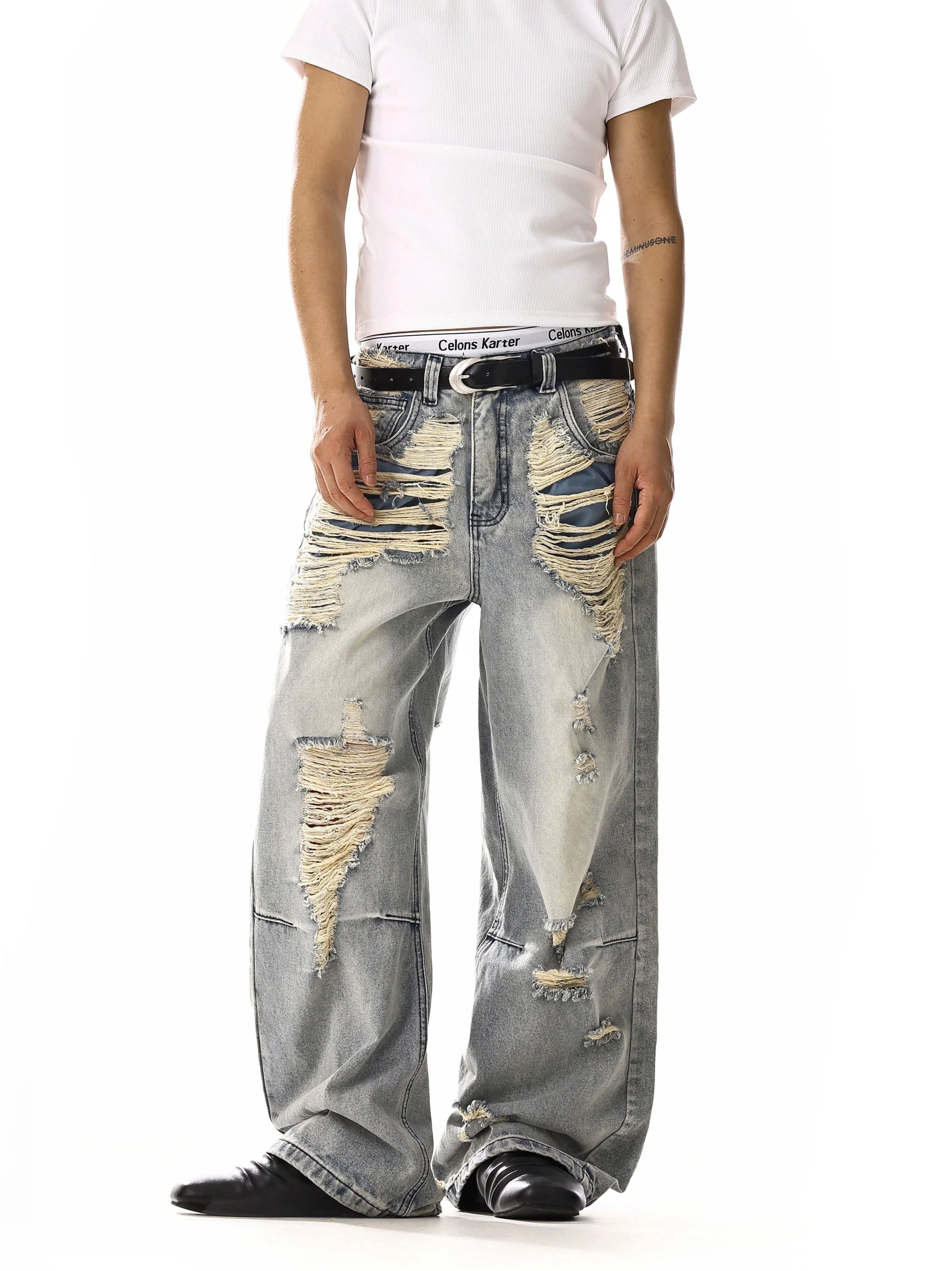- Light blue wash with distressed detailing