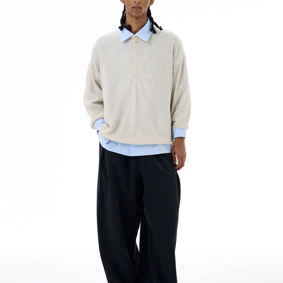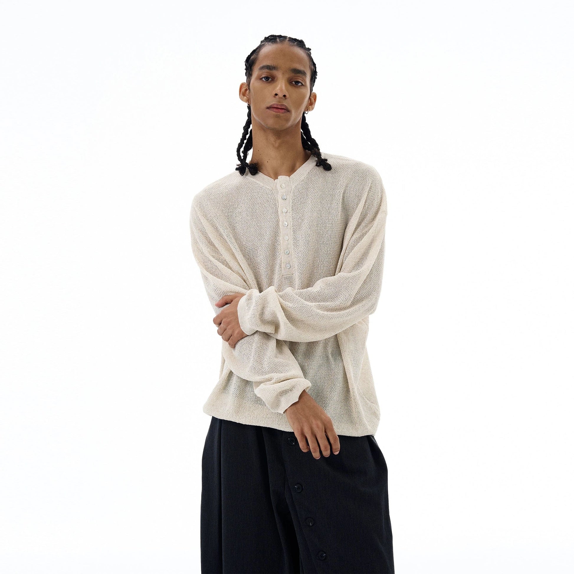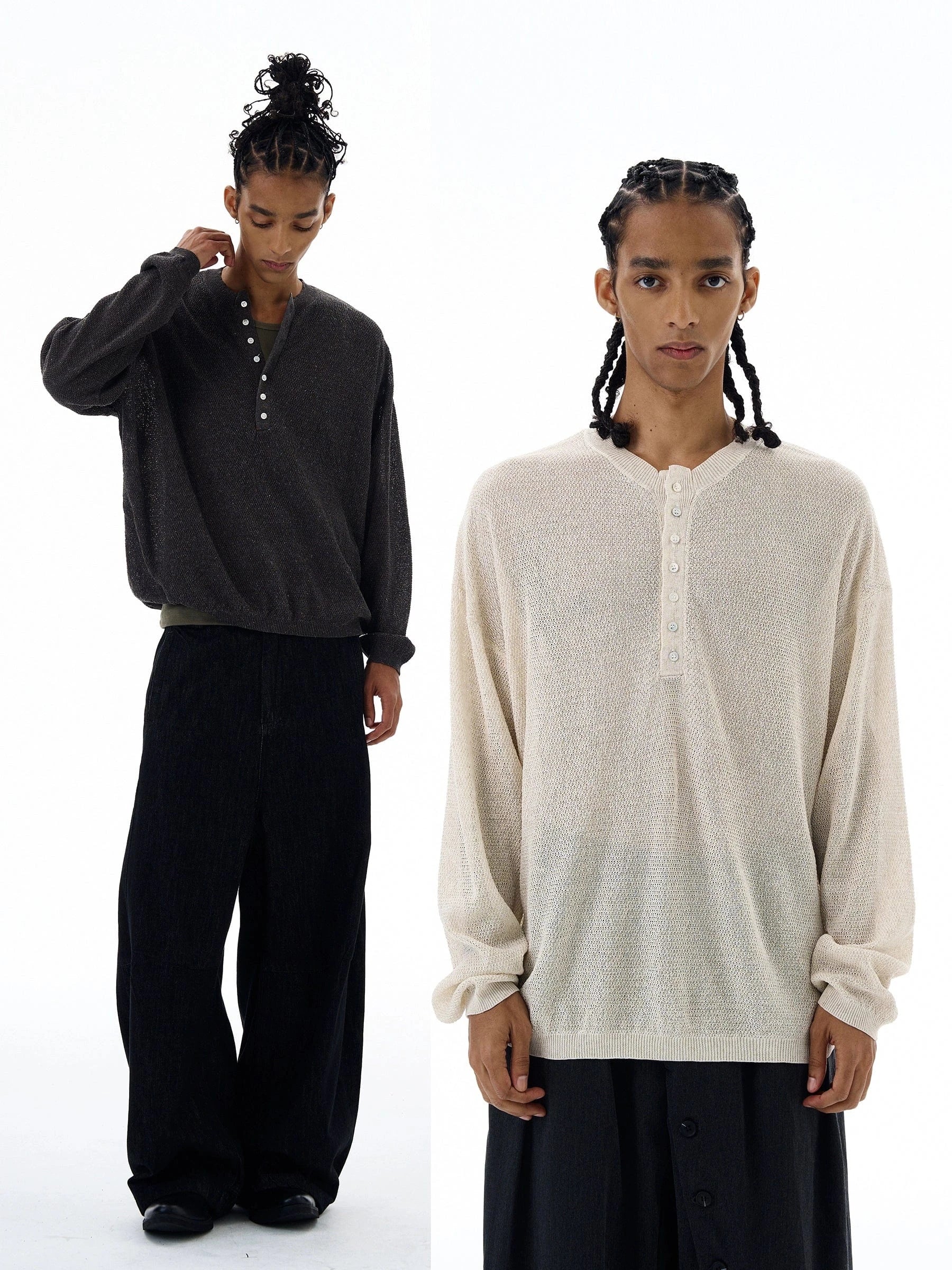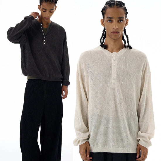 Introducing the RT No. 19526 Hollow Knit Half Button-Up Sweater, a modern layering essential. The hollow-knit fabric delivers breathable warmth in a lightweight silhouette, ideal for transitional seasons. Its half-button-up placket adds casual polish, while the pullover design keeps styling simple.