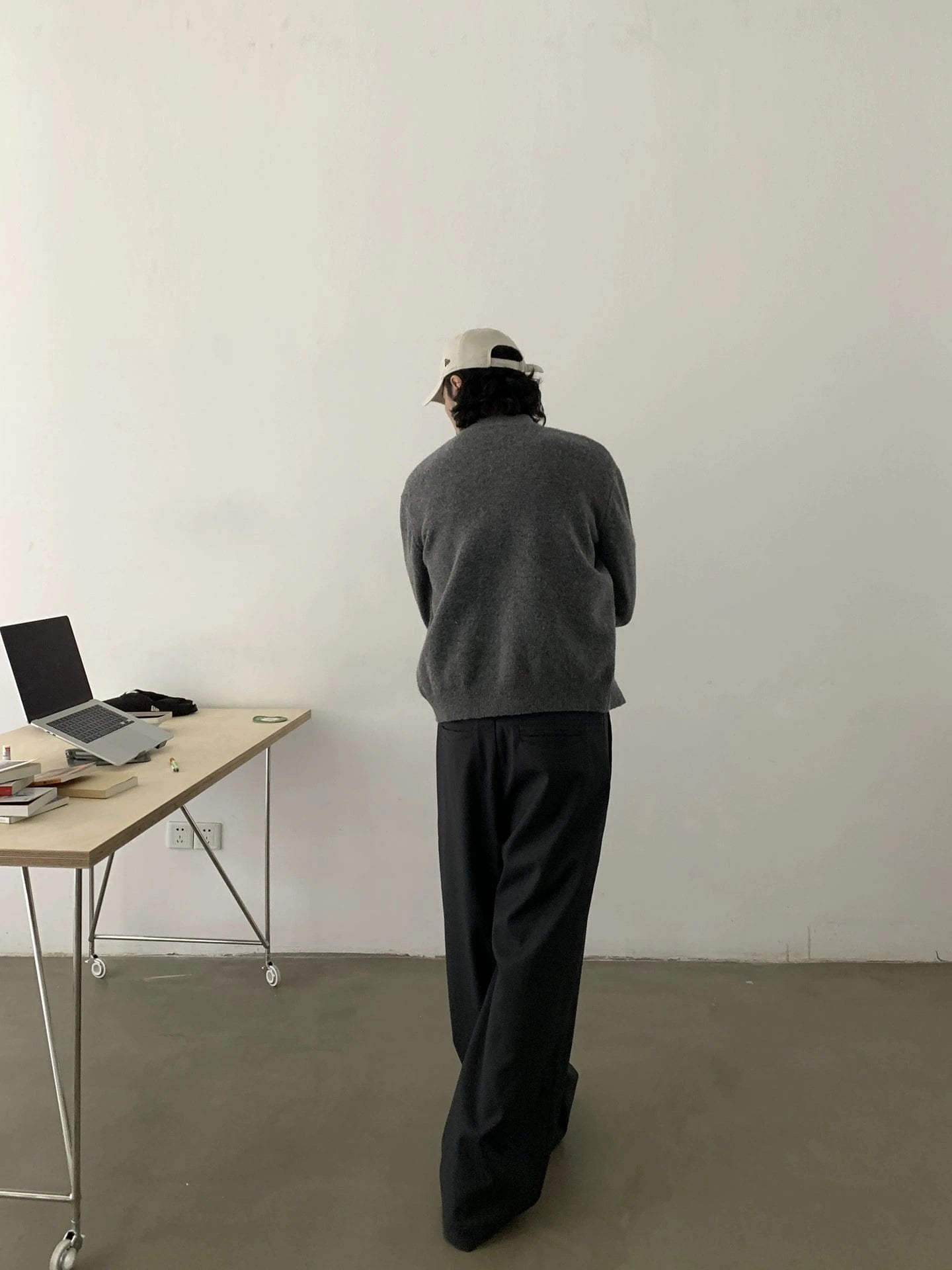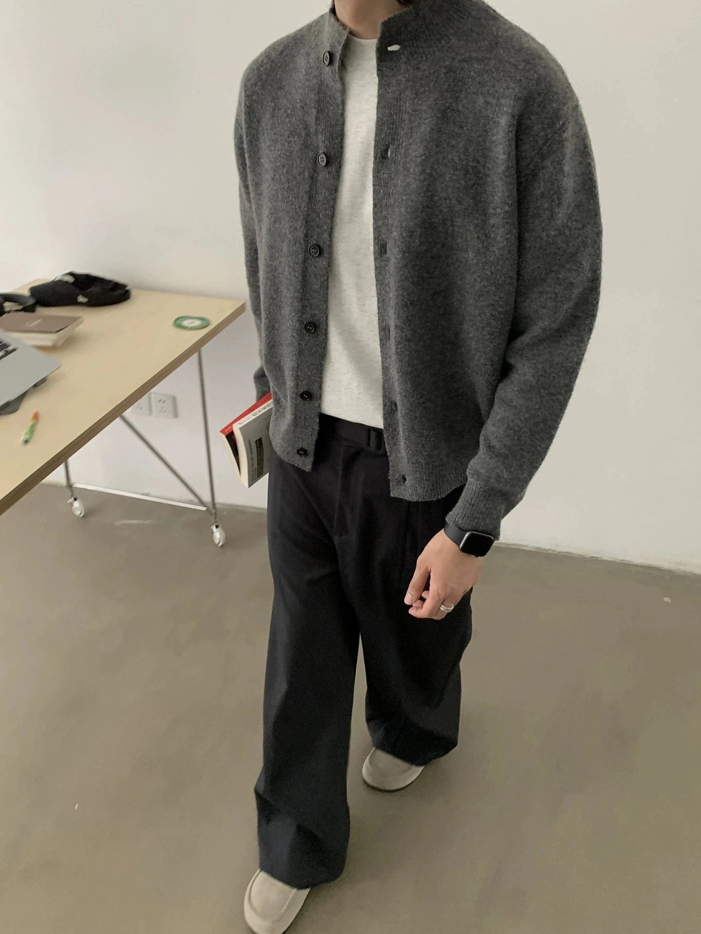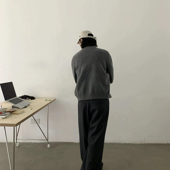 - Knitted construction in a timeless gray shade for a polished, versatile appearance.