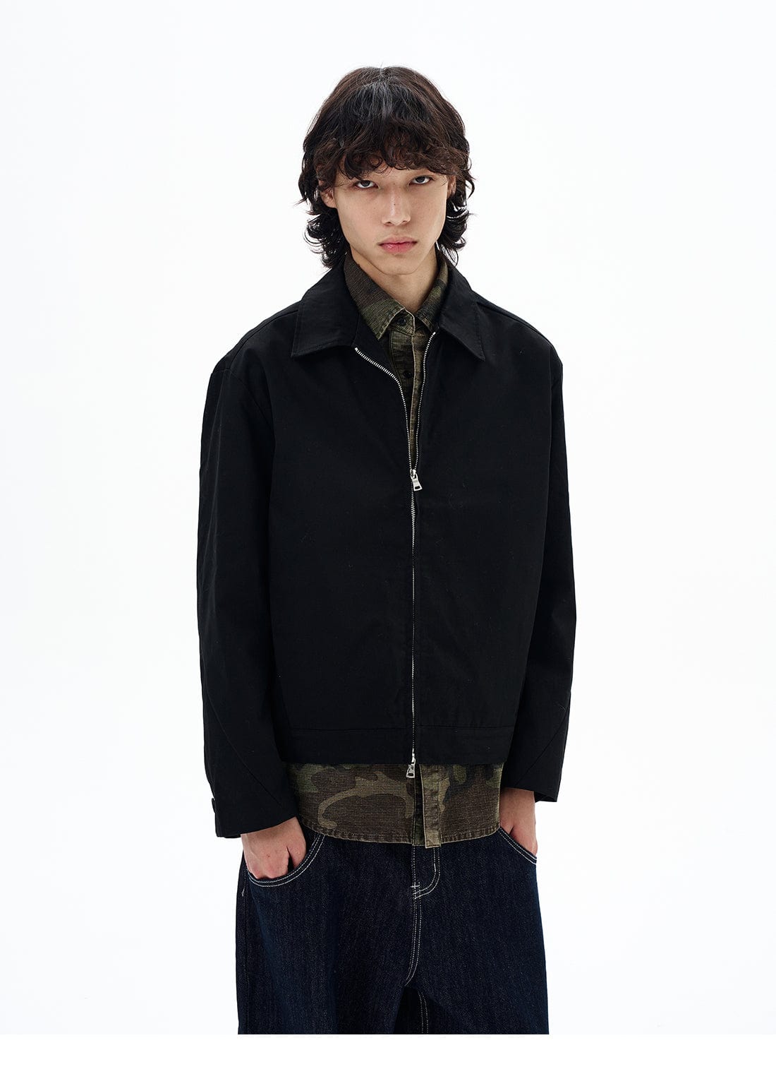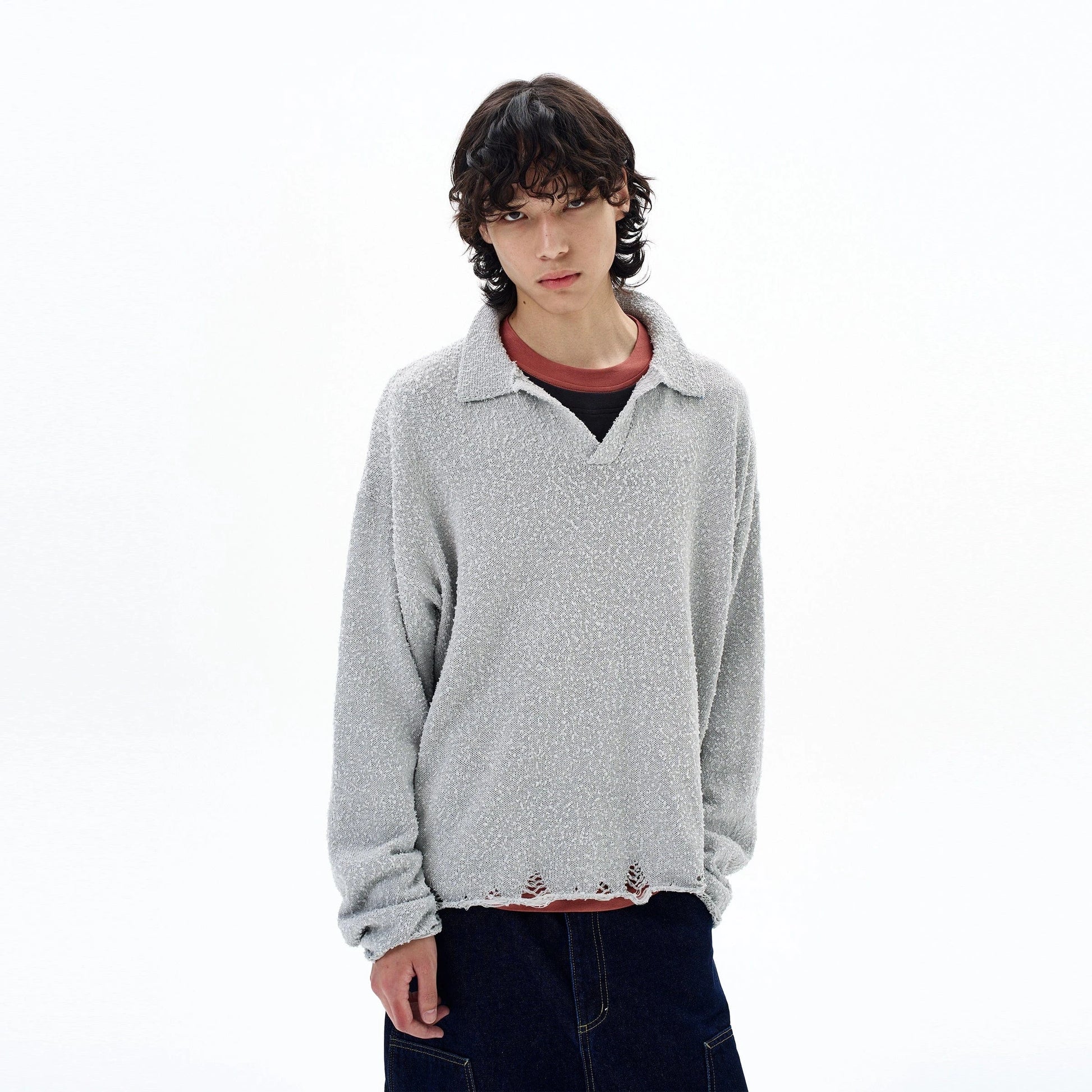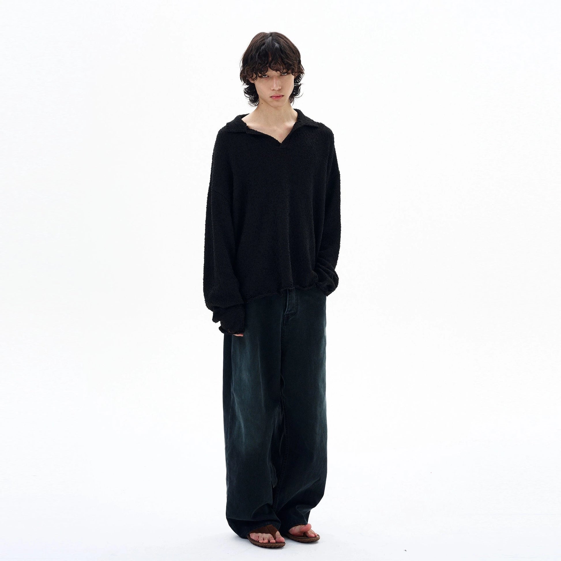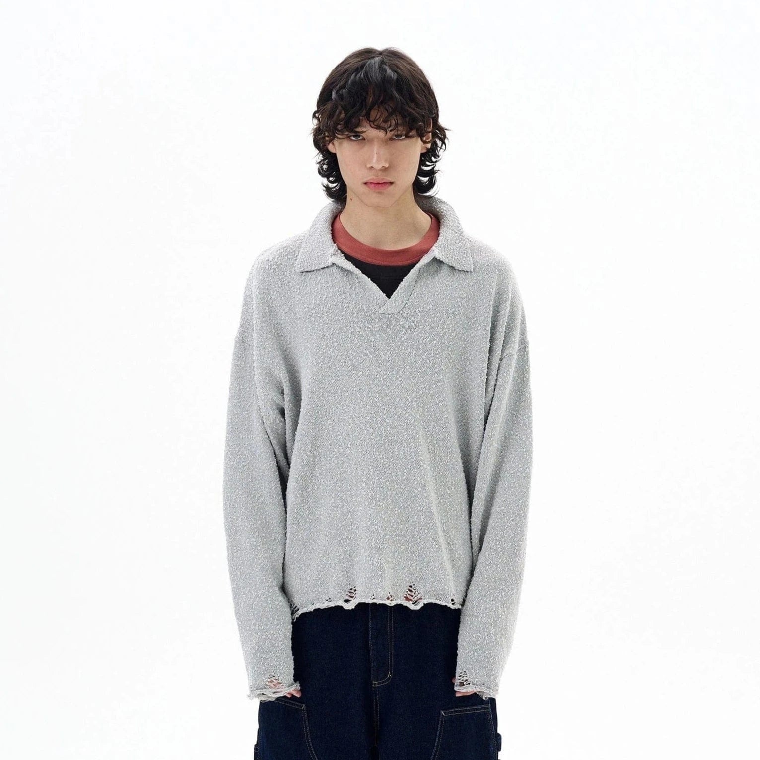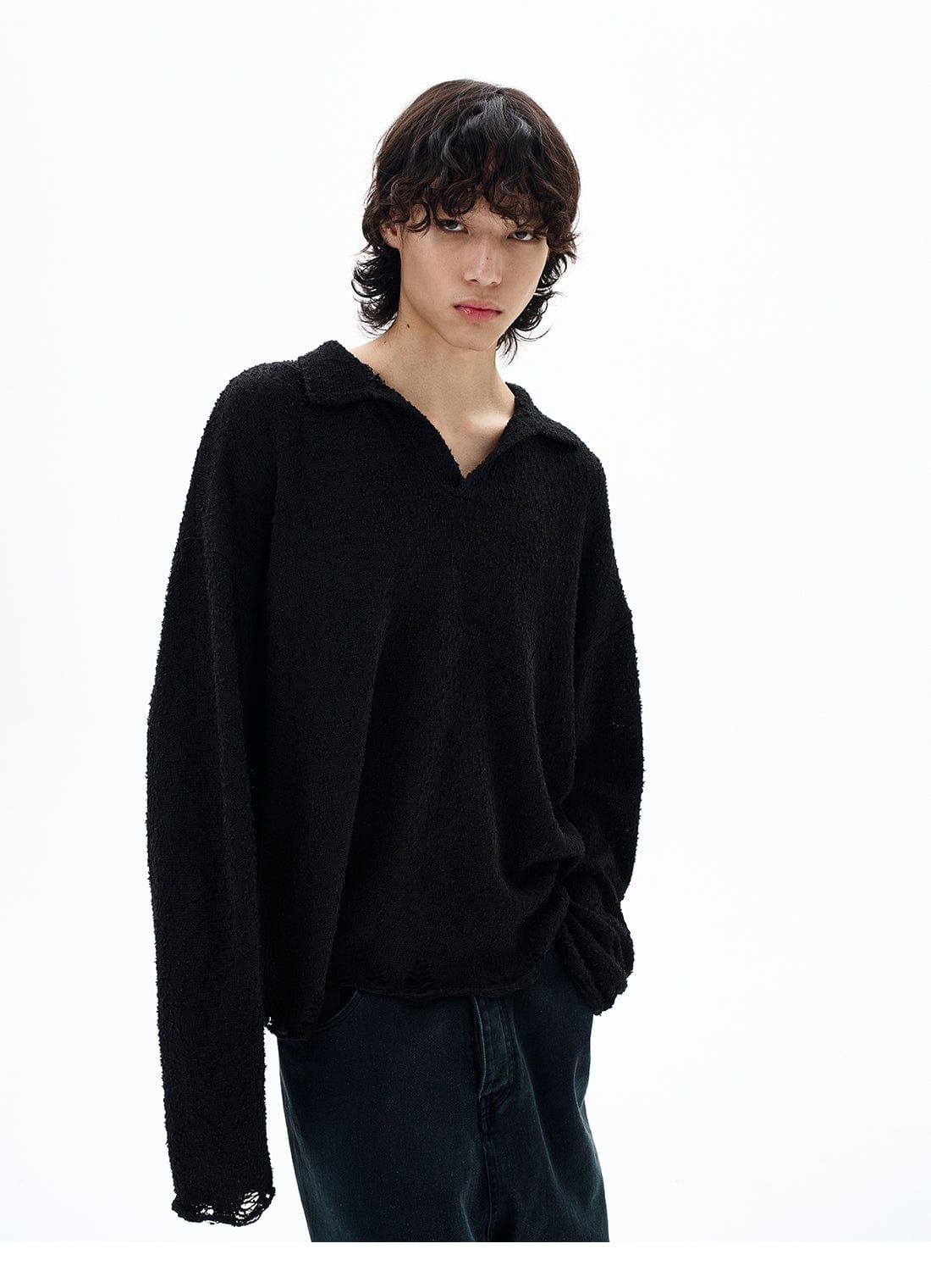 - Loose collar detail complements layered silhouettes.