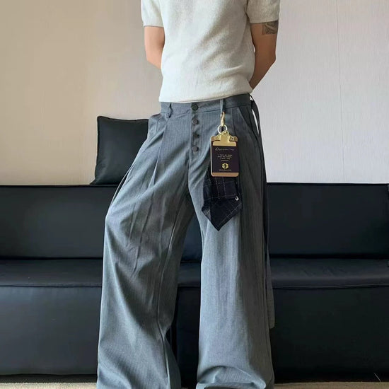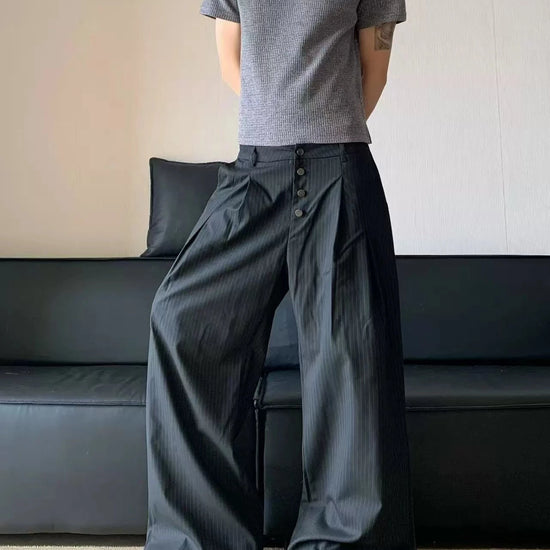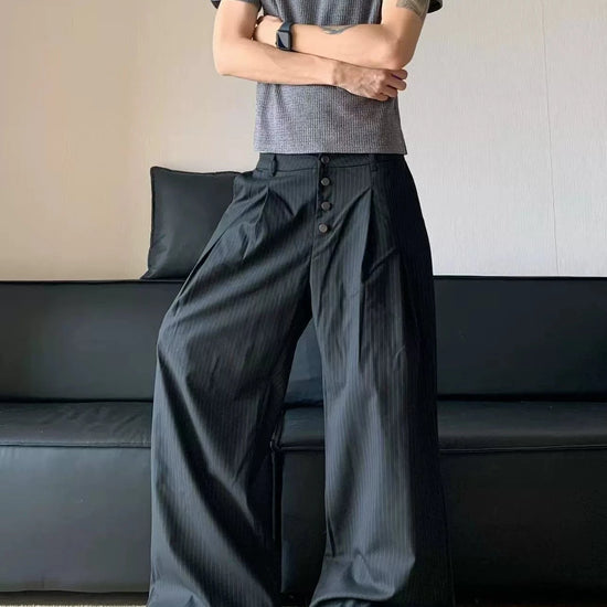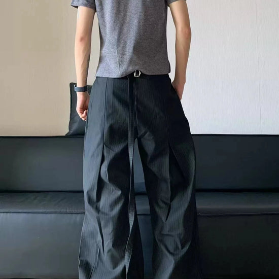 - Pleated striped design with a relaxed baggy straight silhouette for contemporary sophistication.