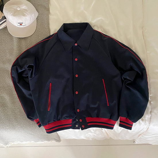 RT No. 9380 Navy Blue Baseball Jacket offers a timeless, sporty silhouette with a clean button-up front, a classic collar, and a bold red stripe for a refined yet athletic look.